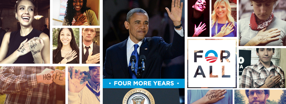 The campaign, "For All", used the Pledge of Allegiance as its foundation. The cmapaign underscored both the president's vision that we are greater together and the values that connect people to him. It provided young Americans the opportunity to share their own visions for the future. The idea: write an idea on your hand, take a photo, post it on Instagram and spread the word. More than 76,000 Twitter users tweeted with the "#ForAll" hashtag, potentially reaching more than 150 million people between September and election day.